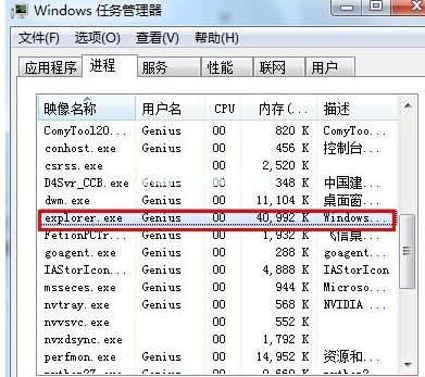 4、在“任務管理器”的“進程”選項卡中,選擇相關(guān)進程,點擊“結(jié)束進程”即可關(guān)閉。如果 “explorer”進程被關(guān)閉,桌面會無法顯示,可以按 “WIN+R” 鍵調(diào)出“運行”窗口,輸入“explorer.exe”,回車,即可重啟該進程,桌面也會正常顯示。