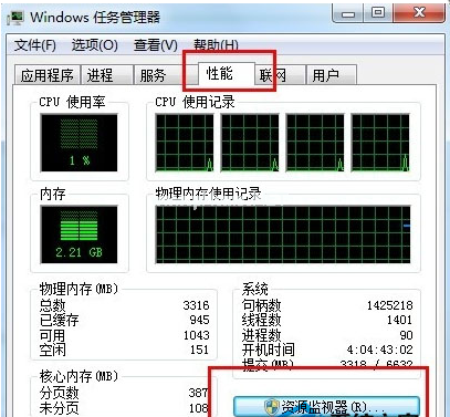 2、選擇“任務管理器”的“性能”選項卡,點擊“資源監(jiān)視器”。