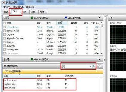 3、在“資源監(jiān)視器”中選擇“CPU”選項卡,在“搜索句柄”輸入框中輸入你的u盤的盤符,比如u盤是I盤,則輸入“I:”,下方會顯示相關(guān)的程序,關(guān)閉相應的進程和程序即可。