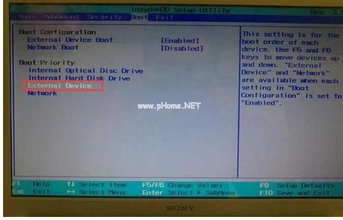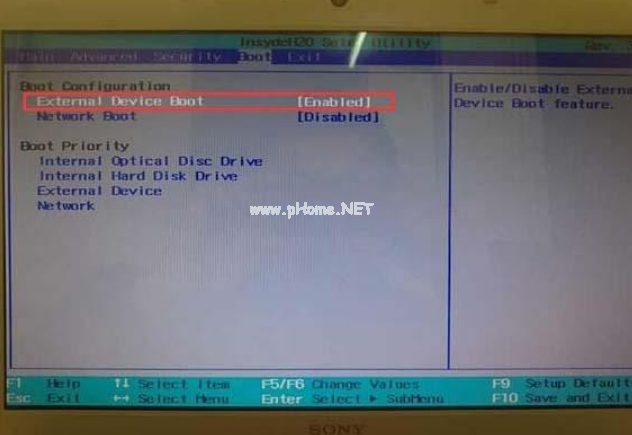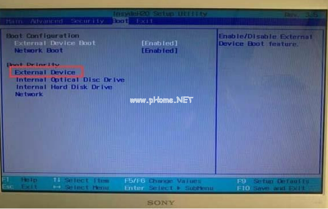 2、然后依然在boot選項(xiàng)卡中,按方向鍵“↑、↓”選擇External Device。