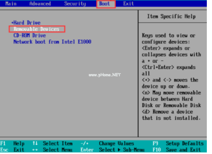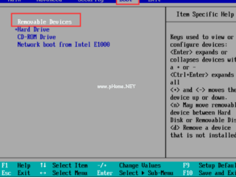3、進(jìn)入BIOS設(shè)置后,我們使用右方向鍵移動(dòng)到“Boot”,接著使用上下方向鍵將光標(biāo)移動(dòng)到U盤(pán)的選項(xiàng)“Removable Devices”上。
