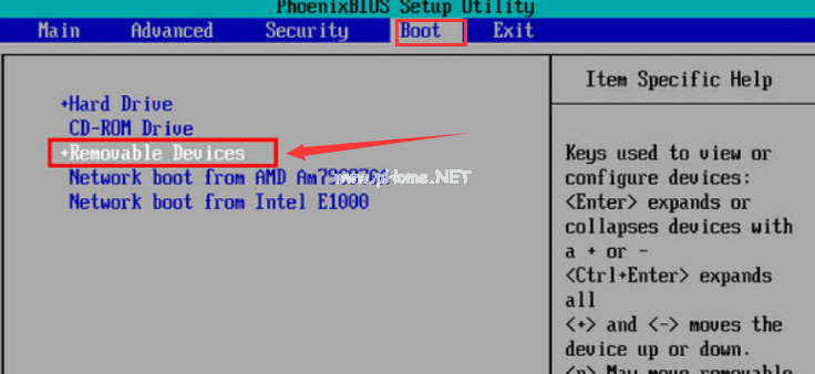 2、把光標移動到“boot”,找到u盤的選項,這里是“removeble device”。