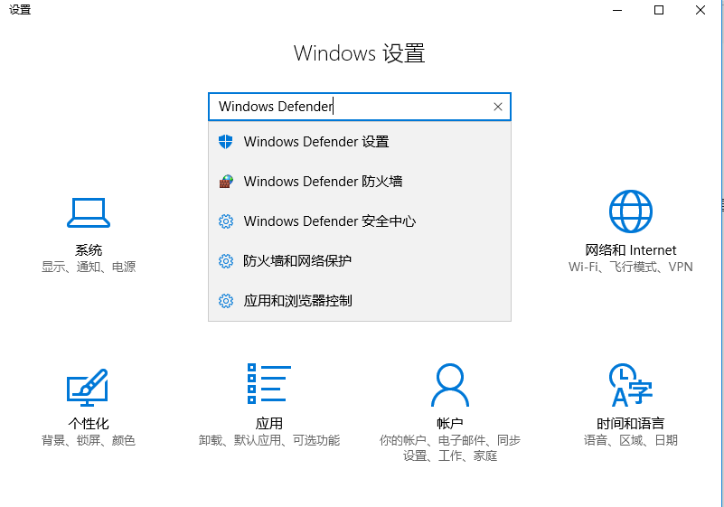1 、點(diǎn)擊桌面左下角的開(kāi)始圖標(biāo),進(jìn)入設(shè)置,在搜索欄中搜索Windows Defender 。
