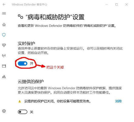 1、進(jìn)入Windows Defender 安全中心,關(guān)閉“病毒和威脅防護(hù)”的實(shí)時(shí)保護(hù);