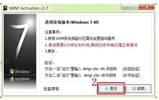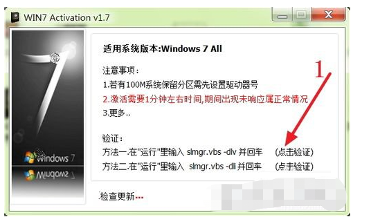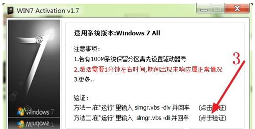1、重新啟動(dòng)系統(tǒng)完成后,再次打開“Win7 activation V1.7”,點(diǎn)擊下圖紅色箭頭所指的地方;