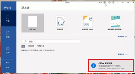 2、相關(guān)設(shè)置都完成只后,如果右下方彈出“office更新可用”的提示,我們點(diǎn)擊它即可。