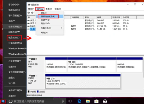 2. 右擊開始菜單選擇【磁盤管理】,逐一選中各個磁盤,點(diǎn)擊【操作】,選擇【重新掃描磁盤】,如果這樣還不行的話,就是電腦的問題了。