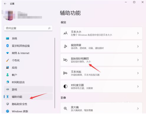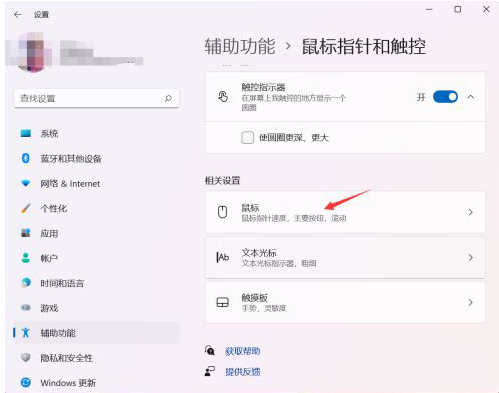 2.在界面左側(cè)找到“輔助功能”,鼠標點擊右側(cè)鼠標指針和觸控。