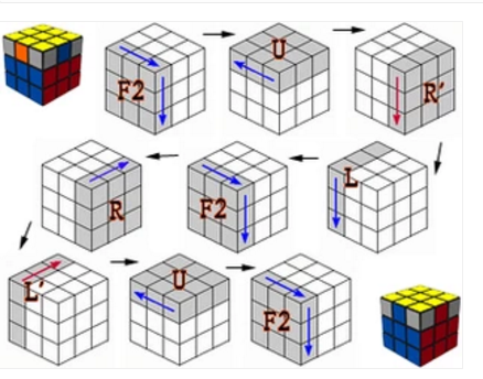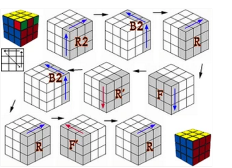 第五步:頂角面位,就是使魔方的四個頂角的頂面色全部調至頂面。