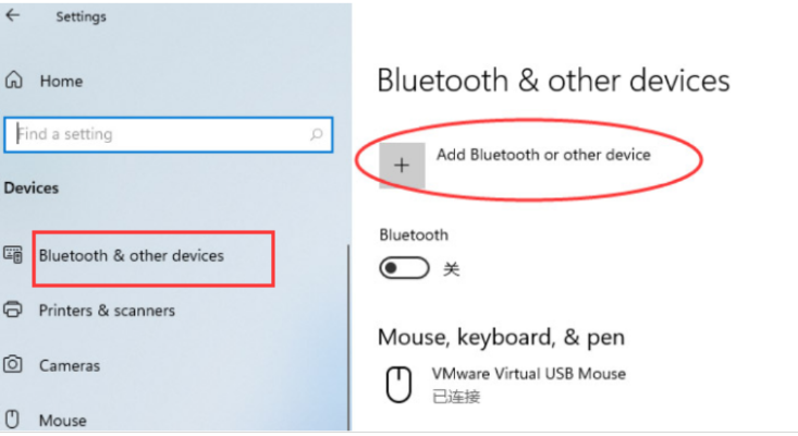 3、進(jìn)入到設(shè)備界面,在左邊找到“藍(lán)牙與其他設(shè)備”選項(xiàng),在右側(cè)的上面鼠標(biāo)點(diǎn)擊“+”點(diǎn)擊添加藍(lán)牙設(shè)備即可。