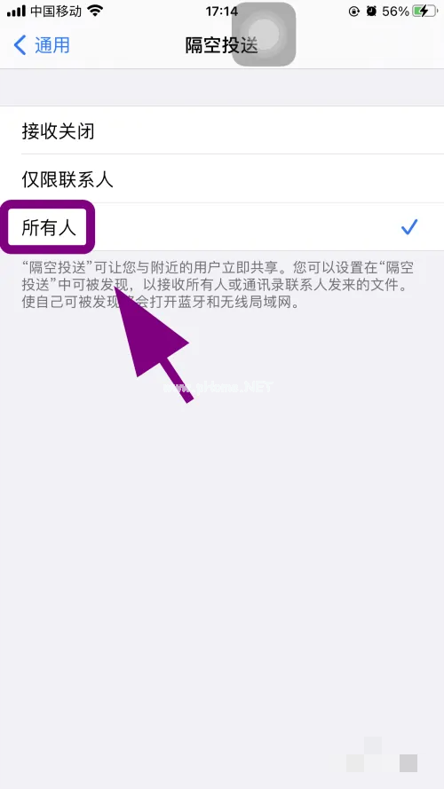 5、在空投設(shè)置頁(yè)面,點(diǎn)擊選擇【所有人】,完成,這樣當(dāng)兩部手機(jī)靠近的時(shí)候會(huì)有響應(yīng),并彈出轉(zhuǎn)賬頁(yè)面,成功解決了這個(gè)問(wèn)題;