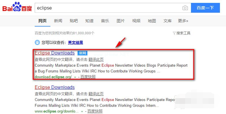 1、在瀏覽器上搜索eclipse,進入eclipse的下載主頁界面,官方網(wǎng)站的右上方一般都會有官網(wǎng)的標志,請大家注意識別。