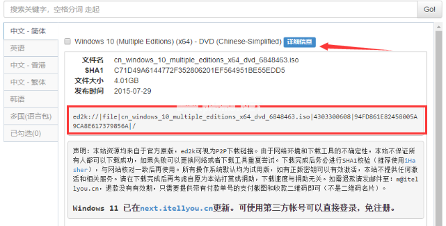 5.鼠標(biāo)點擊右側(cè)的詳細(xì)信息,復(fù)制下方的鏡像文件鏈接到電腦的下載工具當(dāng)中,進(jìn)行下載就可以啦。