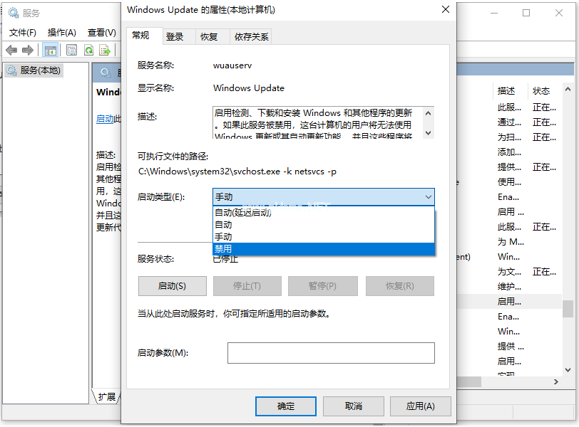 3、進(jìn)入屬性的頁(yè)面,將其改為【已禁用】,點(diǎn)擊確定即可關(guān)掉windows更新。