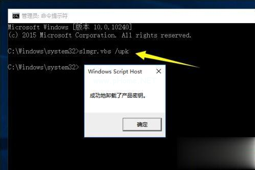 2.從打開的“命令提示符”窗口中,輸入命令:slmgr.vbs /upk ,按回車鍵即可彈出如圖所示的“已成功卸載了產(chǎn)品密鑰”的提示。注意:也可以通過先復(fù)制以上命令,然后在MSDOW窗口中右擊鼠標(biāo)即可完成命令的粘貼操作;