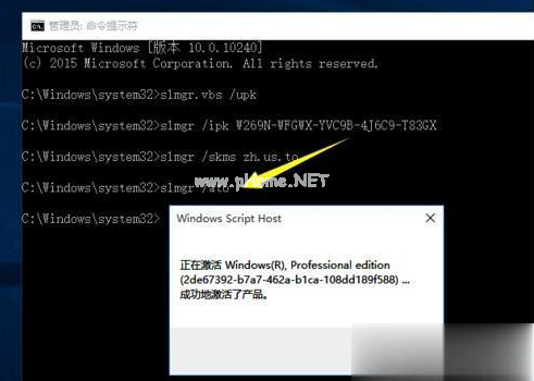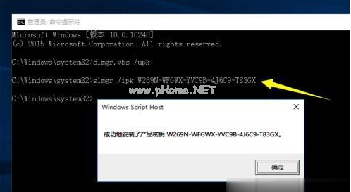 3.接下來再輸入以下命令:slmgr /ipk W269N-WFGWX-YVC9B-4J6C9-T83GX 按回車鍵后將彈出“成功的安裝了產(chǎn)品密鑰”的提示窗口。注:此步驟非常重要,需要根據(jù)所安裝的操作系統(tǒng)版本選擇正確的密鑰;