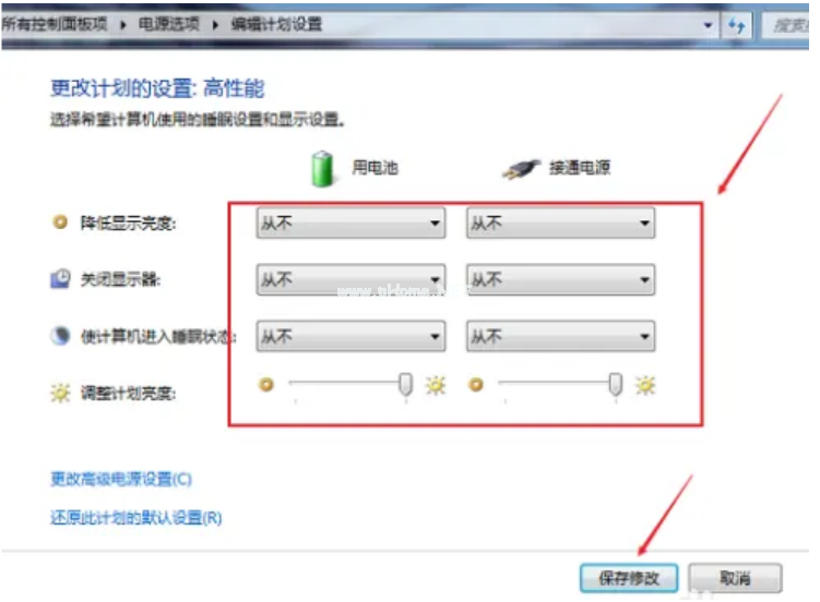 7、然后將里面的選項全部設置為“從不”,點擊“保存修改”,電池就可以激活了。