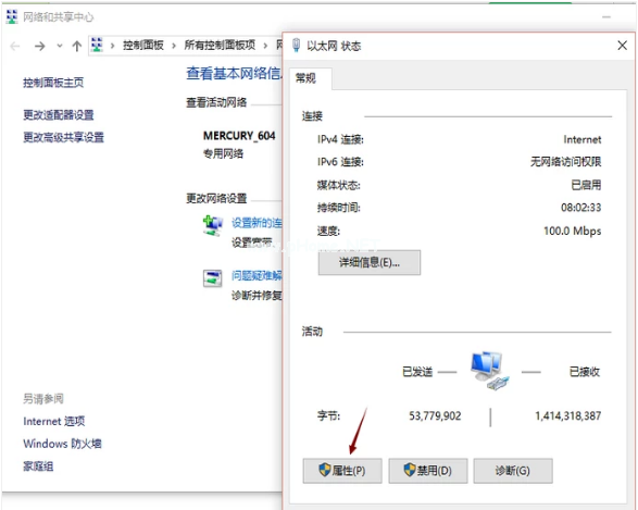 5、設(shè)置完成之后,將開始設(shè)置共享網(wǎng)絡(luò),在主機(jī)上打開網(wǎng)絡(luò)和共享中心,點(diǎn)擊已連接的網(wǎng)絡(luò),選擇“屬性”進(jìn)入。
