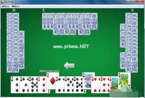 4、在本輪出現(xiàn)紅桃牌,我們右邊玩家因?yàn)闆]有沒花花色的牌選擇出紅桃牌,另外三家梅花牌里最大的玩家就是會得這1分,就是梅花六的玩家。