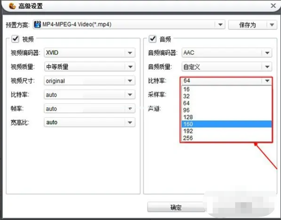 2、在高級設置中音頻框比特率選項中點擊下拉框修改視頻的比特率,修改完成后點擊確定就ok了。
