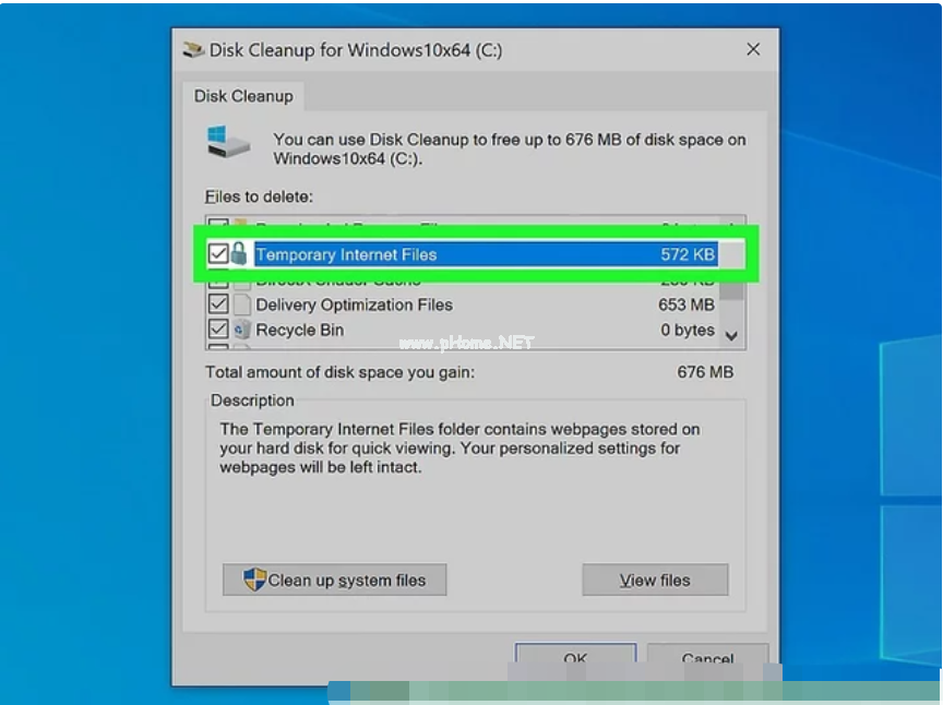 3、單擊以選中“Internet 臨時文件”和“臨時文件”旁邊的復選框。您將看到它們將在列的右側釋放多少空間。最后,點擊OK。該框將消失,您會看到刪除的進度條,完成后會消失。