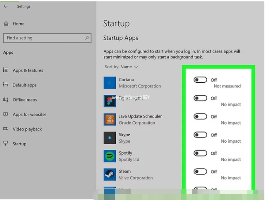 啟動計算機后立即打開并啟動許多程序會使其變慢且滯后。通過按Windows 鍵并鍵入“啟動應用程序”來禁止啟動計算機時啟動項目。單擊“啟動應用程序”系統(tǒng)設置結果并查看應用程序列表。那些說“高影響”的人會讓您的計算機啟動緩慢,因此請通過并單擊開關將它們關閉(灰色表示關閉)。