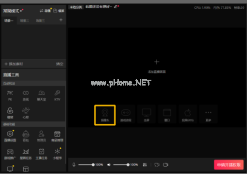 2、進入直播伴侶操作界面后,點擊界面的【攝像頭】。