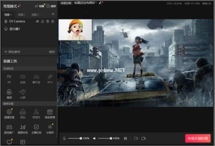 7、嵌入EV虛擬攝像頭,并錄制顯示器進行直播的效果。