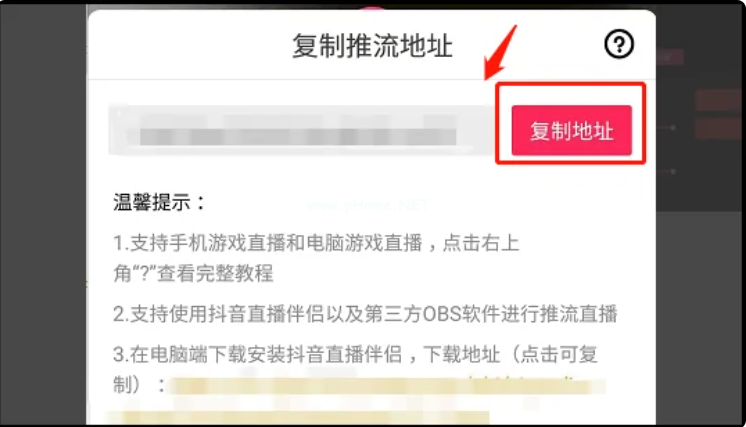 5、復制彈出的推流地址,然后在電腦上安裝“抖音直播伴侶”。