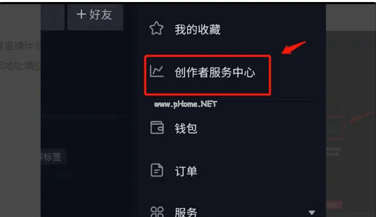 2、在彈出的菜單中點擊“創(chuàng)作者服務中心”,進入創(chuàng)作者服務界面。