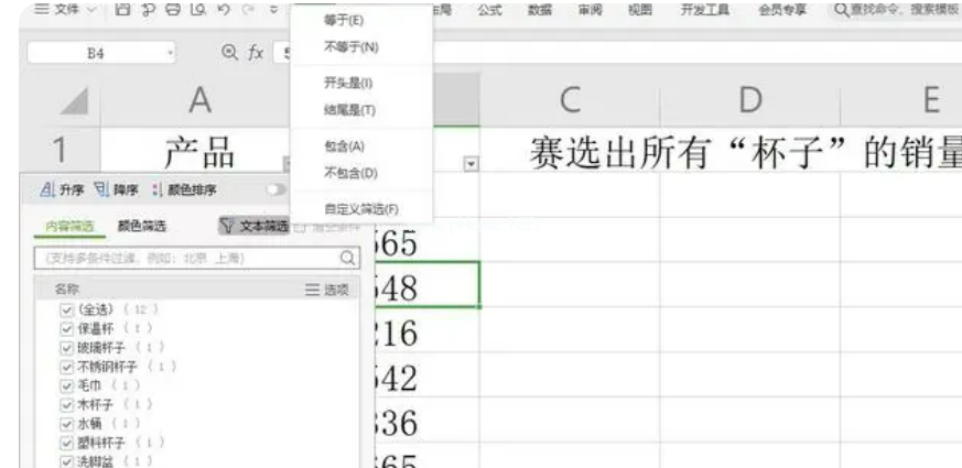 篩選功能里文本篩選(數(shù)字篩選)一般是最常使用到的,顧名思義,即根據(jù)文本內(nèi)容進(jìn)行篩選,文本篩選的條件有11項(xiàng),有等于、不等于、大于、小于、大于或等于、小于或等于、介于以及自定義篩選等。如圖3圖4所示,要篩選出所有“杯子”的產(chǎn)品,點(diǎn)擊篩選按鈕——文本篩選——包含,調(diào)出篩選對(duì)話窗,在包含框輸入“杯”,然后點(diǎn)擊確定,即可篩選出所有杯子的產(chǎn)品。