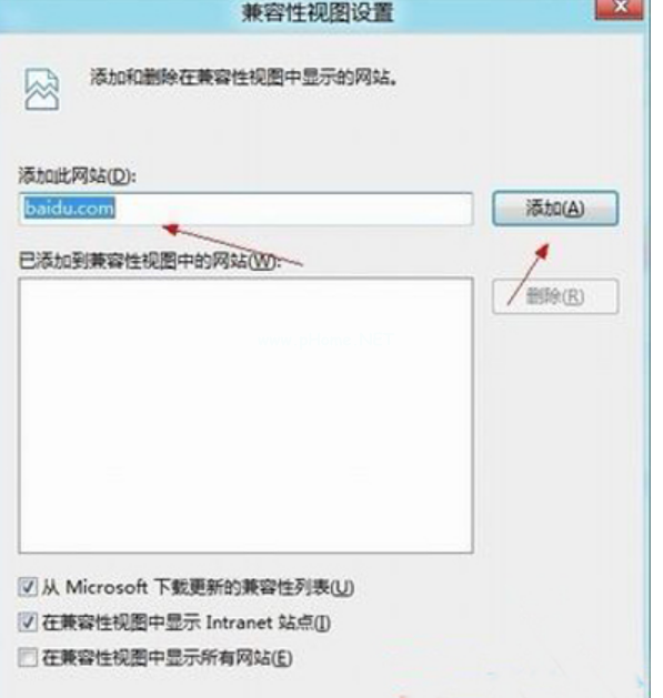 3、在“添加此網(wǎng)站”對(duì)話框中鍵入百度網(wǎng)站,單擊“添加”按鈕,如果要在所有網(wǎng)站中使用兼容性視圖,請(qǐng)?jiān)谙旅婀催x“在兼容性視圖中顯示所有網(wǎng)站”即可。