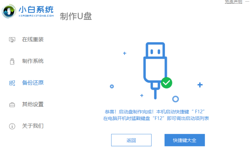6.當制作完成后,我們點擊返回,然后關(guān)閉軟件,這樣我們的u盤啟動盤就制作完成啦。