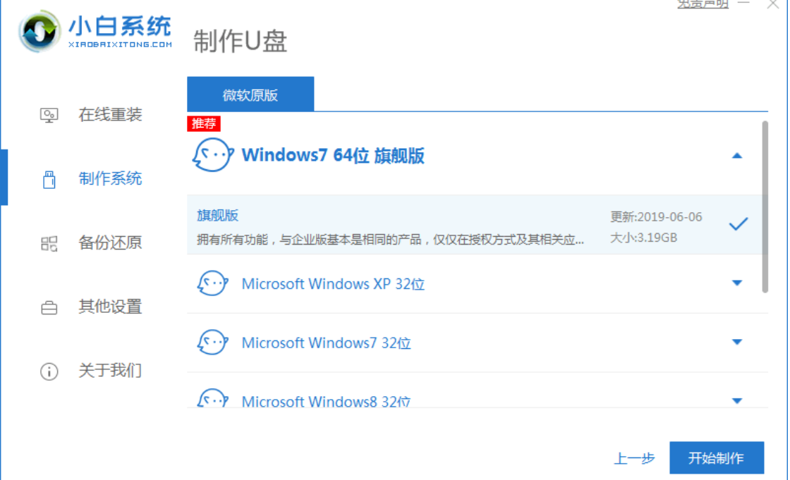 3.在頁面中,選擇我們需要下載的系統(tǒng),選擇好之后點擊“開始制作”。