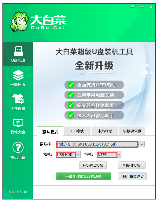 2、 選擇“默認(rèn)模式”,在磁盤列表中選擇需要制作啟動(dòng)的設(shè)備,在模式選項(xiàng)中選擇“USB-HDD”,格式選擇“NTFS”