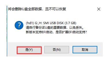 4、 在彈出的信息提示窗口中,點(diǎn)擊“是”(注:制作啟動(dòng)盤會(huì)格式化U盤,請(qǐng)?zhí)崆皞浞莺肬盤數(shù)據(jù)!)