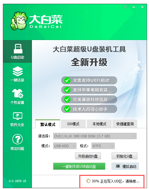 5、 這時(shí)候大白菜裝機(jī)版U盤工具對(duì)U盤寫入大白菜相關(guān)數(shù)據(jù),請(qǐng)耐心等待