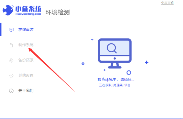 1、關(guān)閉計算機上運行的殺毒軟件,打開小魚一鍵重裝系統(tǒng),選擇制作系統(tǒng)[U盤模式]。