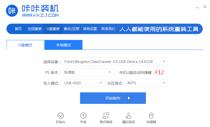 1、下載安裝咔咔裝機(jī)一鍵重裝系統(tǒng)工具并打開,插入一個(gè)8g以上的空白u(yù)盤,選擇u盤重裝系統(tǒng)模式點(diǎn)擊開始制作。