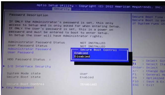 2、進(jìn)入之后用方向鍵與回車鍵操作,在Boot菜單下或其他菜單如Security,把Secure Boot修改為Disabled(表示禁用安全引導(dǎo))與電腦啟動(dòng)熱鍵不同。