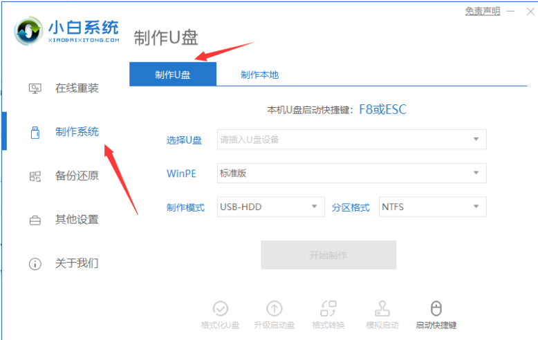 1、下載安裝一個(gè)小白一鍵重裝系統(tǒng)軟件,選擇制作系統(tǒng)里的制作U盤選項(xiàng)。