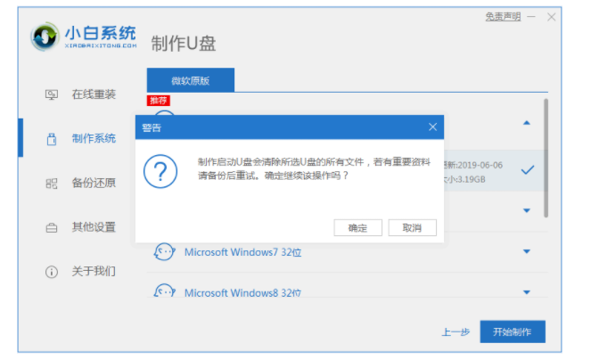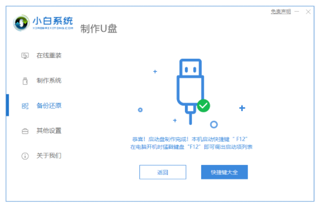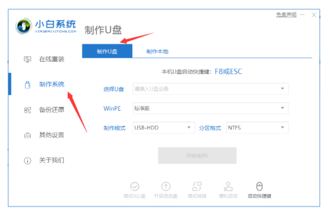 1、下載并運行小白一鍵重裝系統(tǒng)軟件,插入U盤,選擇制作系統(tǒng)里的制作U盤選項。