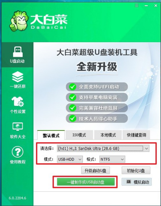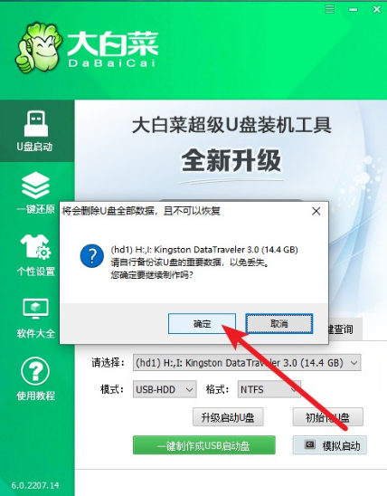 1.首先我們需要下載一個大白菜工具,然后把一個8g的可用內(nèi)存的U盤插入電腦,u盤的模式和格式,如果沒有特殊要求,可以默認選擇USB—HDD以及NTFS,點擊一鍵制作u盤啟動盤。