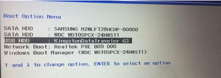 6、最后我們插入啟動(dòng)盤到電腦接口上,重啟電腦時(shí)快速按F12或FN+F12調(diào)出啟動(dòng)管理窗口界面,選擇USB HDD按回車鍵進(jìn)入PE系統(tǒng)即可使用u盤重裝系統(tǒng)。