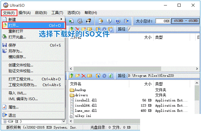 2,打開UltraISO后,選擇主菜單中的“文件”——“打開”,打開剛才下載好的鏡像ISO文件,如下圖所示;