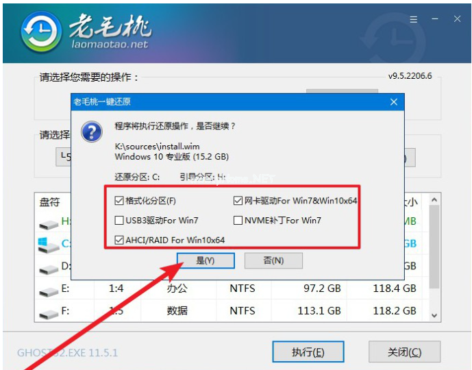 2、在一鍵還原窗口中,如無其他特別情況的話,建議默認設置,直接點擊“是”。