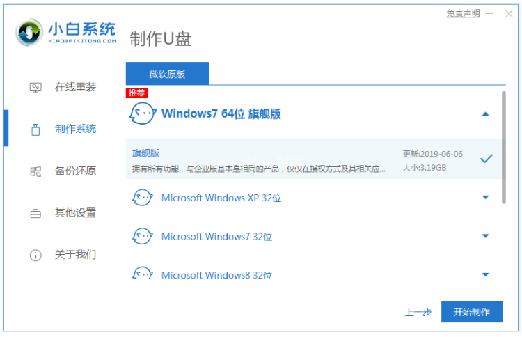 2、選擇win7操作系統(tǒng),點(diǎn)擊開(kāi)始制作。