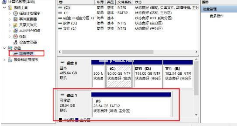 4、 進入管理頁面之后,點擊“磁盤管理”,確認(rèn)u盤的盤號。