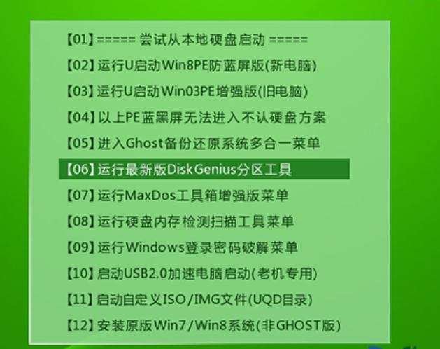1、把u啟動v6.2裝機(jī)版u盤啟動盤插在電腦usb接口上,然后重啟電腦,在出現(xiàn)開機(jī)畫面時用一鍵u盤啟動快捷鍵的方法進(jìn)入到u啟動主菜單界面,選擇【06】運(yùn)行最新版DiskGenius分區(qū)工具,按回車鍵確認(rèn)選擇,如下圖所示:
