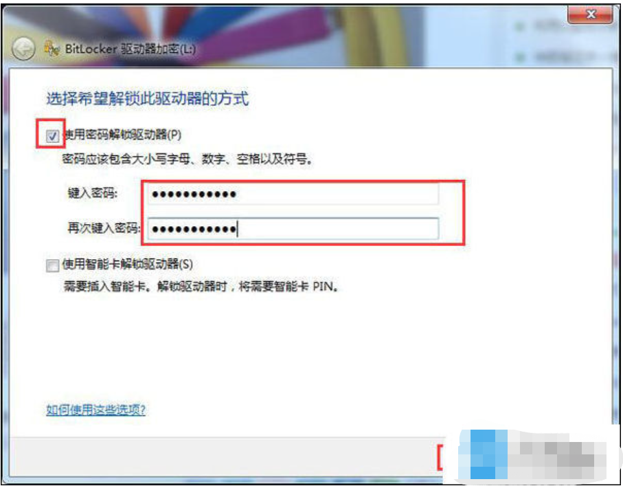 2、勾選使用密碼解鎖驅(qū)動器,輸入密碼,點擊下一步。